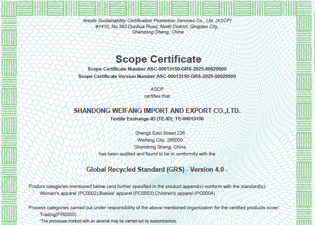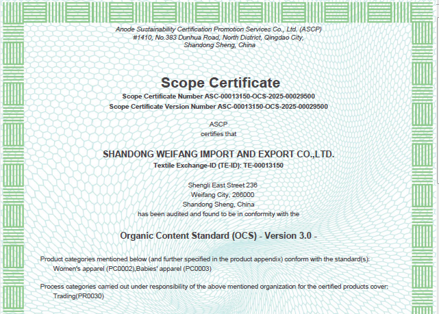 公司自營(yíng)和代理服裝、食品、五金、化工、機(jī)電等各類商品及技術(shù)的進(jìn)出口業(yè)務(wù),公司有專門的生產(chǎn)、加工基地,并通過了Oeko - Tex Standard 100、GRS、OCS、RCS、USCTP等多項(xiàng)認(rèn)證,可以按客戶要求設(shè)計(jì)生產(chǎn),同時(shí)承辦中外合資經(jīng)營(yíng)、合作生產(chǎn)、開展“三來(lái)一補(bǔ)”以及技術(shù)輸出、易貨、邊境貿(mào)易等業(yè)務(wù)。公司產(chǎn)品出口到日本、法國(guó)、俄羅斯等50多個(gè)國(guó)家或地區(qū)。